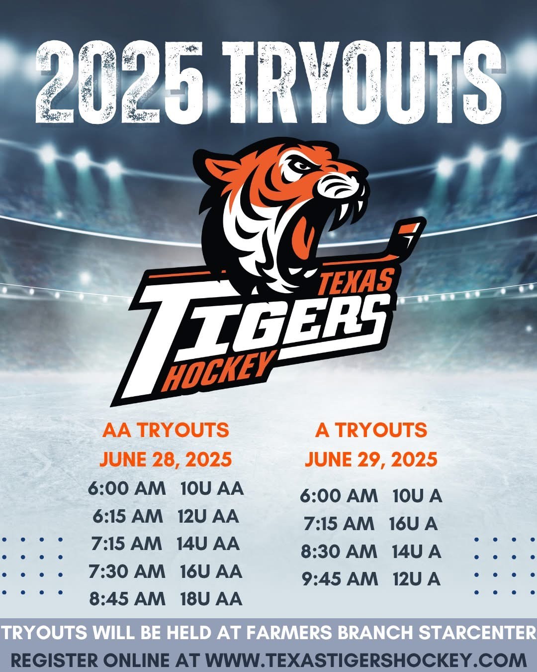 Texas Tigers Hockey is a member of the Texas Hockey League and will field teams in the 10U A, 10U AA, 12U A, 12U AA, 14U A, 14U AA, 16U A, 16U AA and 18U AA divisions.